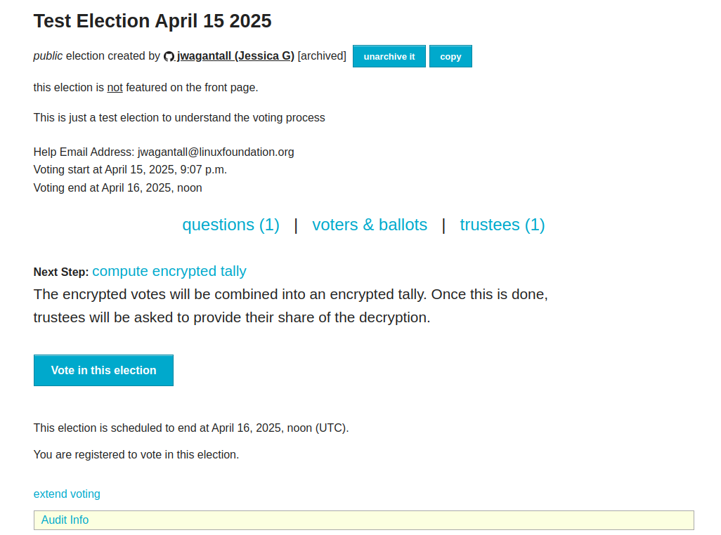 While the nomination process is open, the LFDT Community Architects will work in parallel to build the election template using Helios Voting. This template contains general information including the name of the election, description, type (election or referendum), privacy options and voting details.